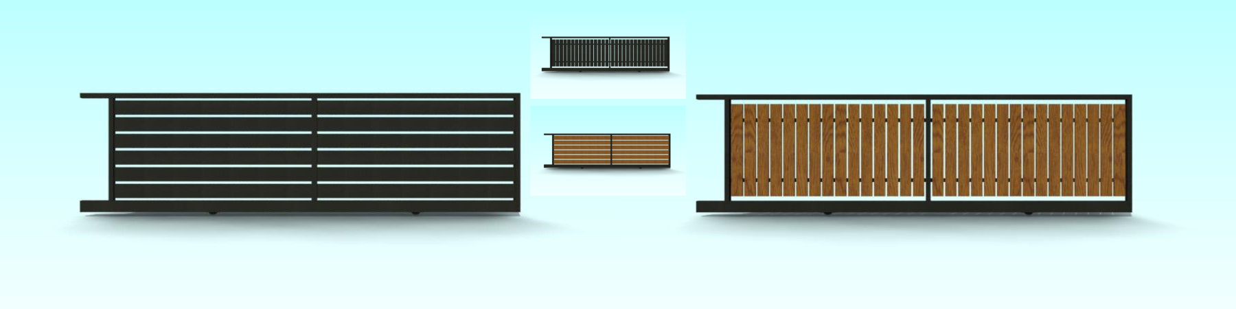 I cancelli sono disponibili in tre versioni: pedonale 1 anta, a libro 2 ante e scorrevole. La struttura perimetrale portante viene realizzata in acciaio zincato verniciata a polveri ed il disegno centrale si può definire con doghe verticali oppure orizzontali. I cancelli sono completi di accessori (esclusa automazione) e sono disponibili in svariate finiture RAL ed effetto legno (effetto legno solo per la parte centrale, la struttura perimetrale sempre in finitura RAL). A preventivo cancello su misura in base ai profilati disponibili a catalogo.